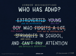 Wer hat ADHS? Nicht nur Jungs, nicht nur Zappelphilippe, nicht nur solche, die Mühe mit der Schule haben oder mit Aufmerksam sein (Bild Dani Donovan https://adhddd.com)
